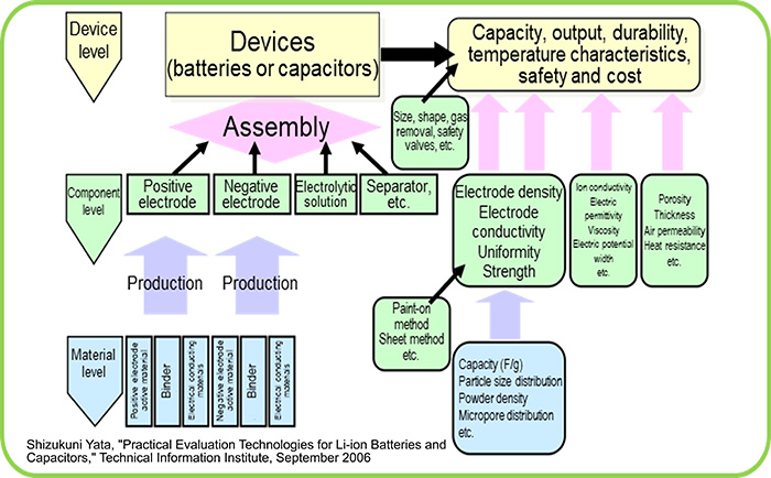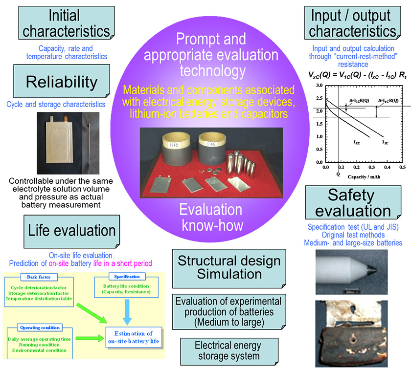 Energy storage device evaluation items include initial characteristics such as capacity, internal resistance, output, and temperature characteristics, as well as durability and safety such as cycle characteristics and storage characteristics. In the properties of electrodes, electrolytes, separators, etc. (member level), positive electrode materials, and negative electrode materials (material level) are intertwined in a combined and multi-layer manner, * it is essential to comprehensively analyze and judge the evaluation data at every level.