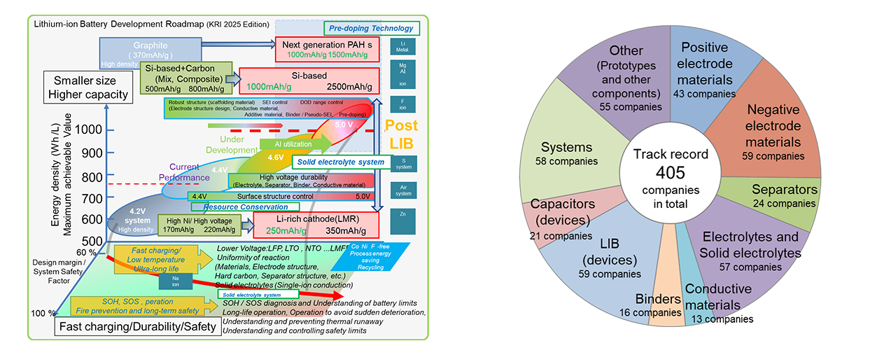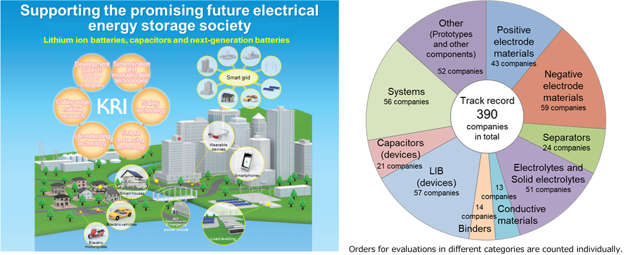 KRI One-stop Service for Electrical Energy Storage Devices offers quick, accurate and high quality service, catering to the diverse needs of our clients and rapidly changing market trends through our coherent development structure that covers everything from “material technologies to system technologies” and “research and development, evaluation and analysis.”