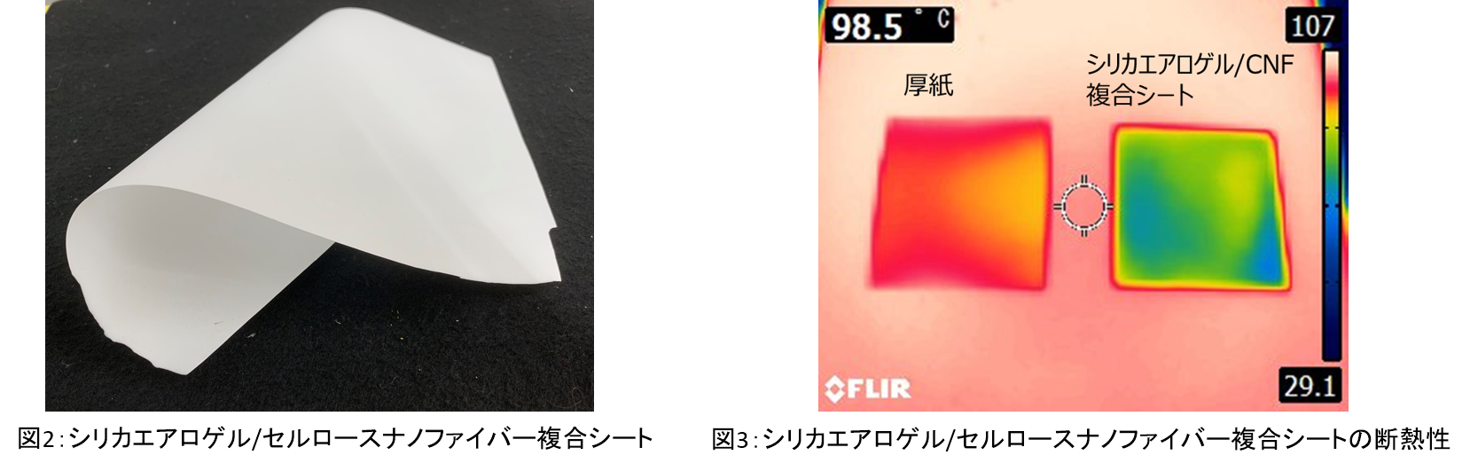 また、セルロースナノファイバーのネットは非常に細かく、シリカエアロゲル粒子が粉落ちししないため、精密機器の断熱材として利用することも可能です。