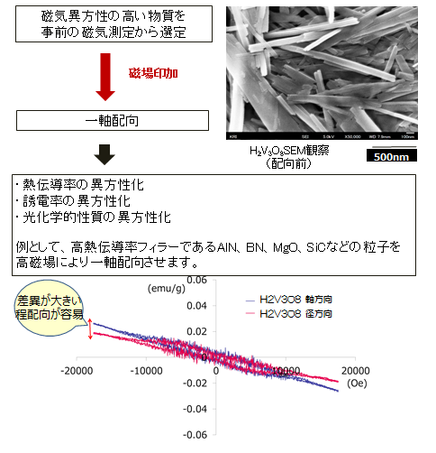 - 1)磁気異方性をもつフィラーを、磁場により一軸方向に配向させることで、機械的、熱的、電気的物性を制御し新たな機能を付与します。