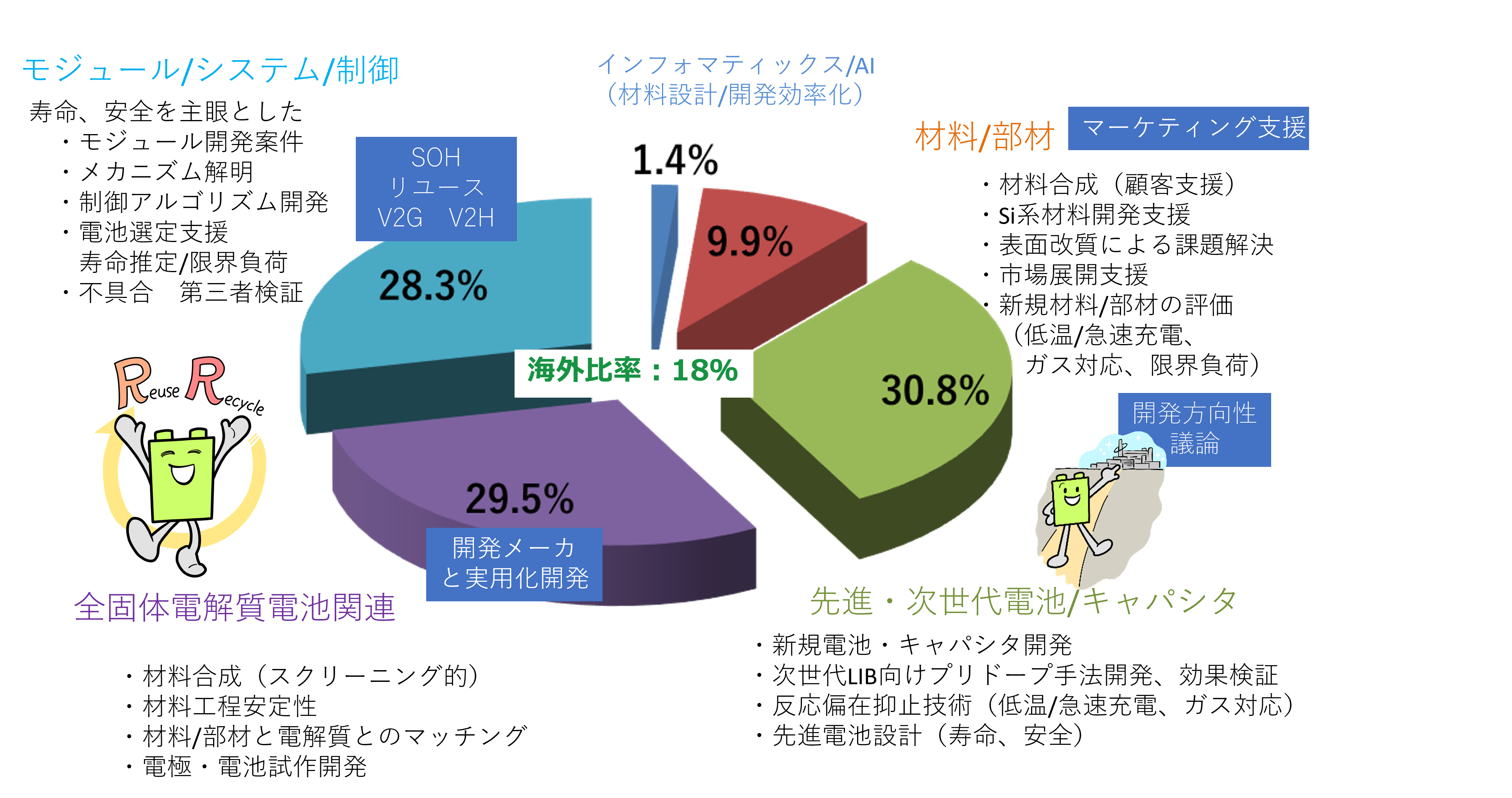 蓄電分野における「材料技術からシステム技術」、「研究開発・評価・分析」まで一貫した開発支援体制をとり、多様なクライアントさまのニーズに応えて参ります。