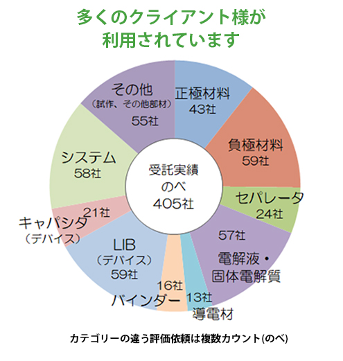 - ● 約370社の蓄電デバイス(電池・キャパシタ)関連材料、部材、デバイスの評価・解析を実施
